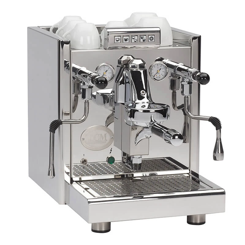 Die zentral verbaute, patentierte ECM-E61-Brühgruppe verspricht Beste Brühergebnisse. Der mitgelieferte Siebträger ist ergonomisch geformt und sorgt für ein stimmiges Gesamtbild der Maschine. Mithilfe des beleuchteten Bedienelement an der Oberseite lassen sich die Wichtigsten Funktionen der Maschine steuern. Über die beiden Manometer kann der Druck im 1,8 l Edelstahlkessel und im Pumpenkreislauf zuverlässig abgelesen werden. Die Hochleistungs-Rotationspumpe sorgt für den nötigen Brühdruck von bis zu 15 Bar. Auf der Oberseite der Maschine befindet sich zusätzlich noch eine Tassenablage mit Tassenwärmer.