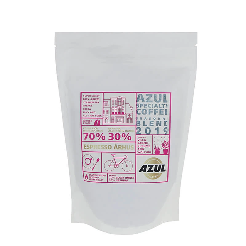 Für den Aarhus Blend hat sich die Azul Rösterei von “Scandinavian light roasting“ inspirieren lassen. Das Resultat ist eine 70/30 Arabica zu Robusta Mischung sorgfältig ausgewählter Bohnen. Die verwendeten Arabicas sind Costa Rica Aguilera Bros, die Robusta Bohnen sind Ethiopia Alemayehu Daniel. Der Blend überzeugt durch seinen vollen Körper, sowie eine komplexes Zusammenspiel vieler Fruchtnuancen wie etwa Erdbeere und Kirsche.