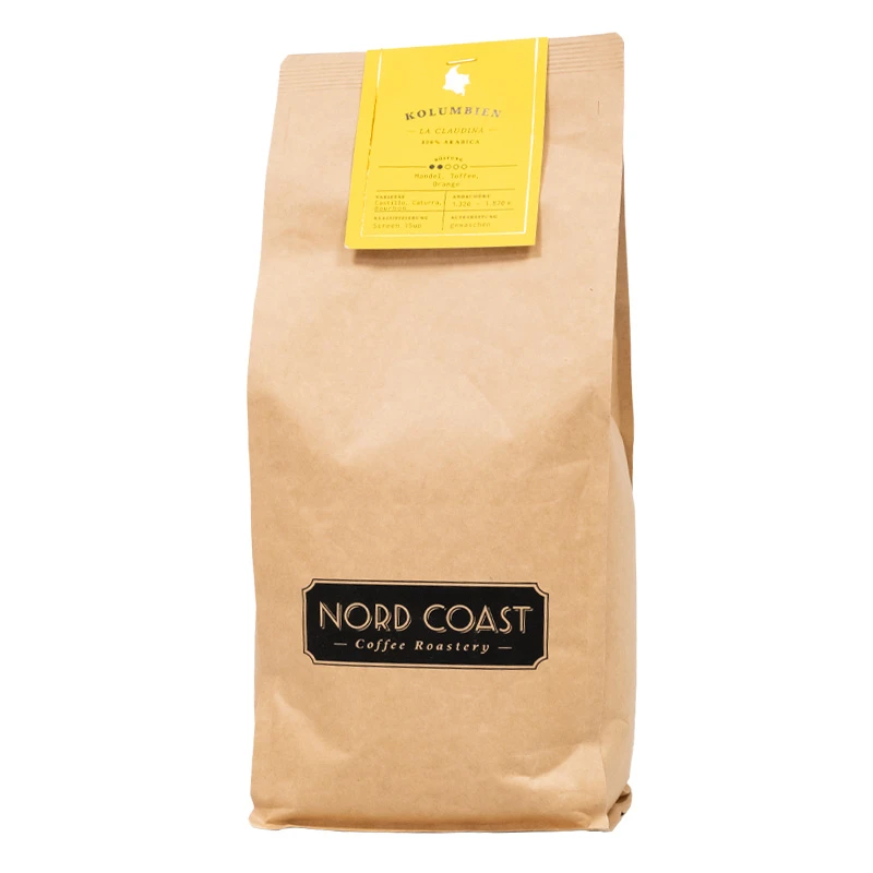 Kolumbien La Claudina von der Nord Coast Coffee Roastery besteht zu 100% aus Arabica Bohnen. Diese sind von der Varietät Castillo, Caturra sowie Bourbon. Geschmacklich ist die helle Röstung süß und fruchtig. Noten von Mandel und Toffee werden von Orangenaromen herrlich ergänzt.