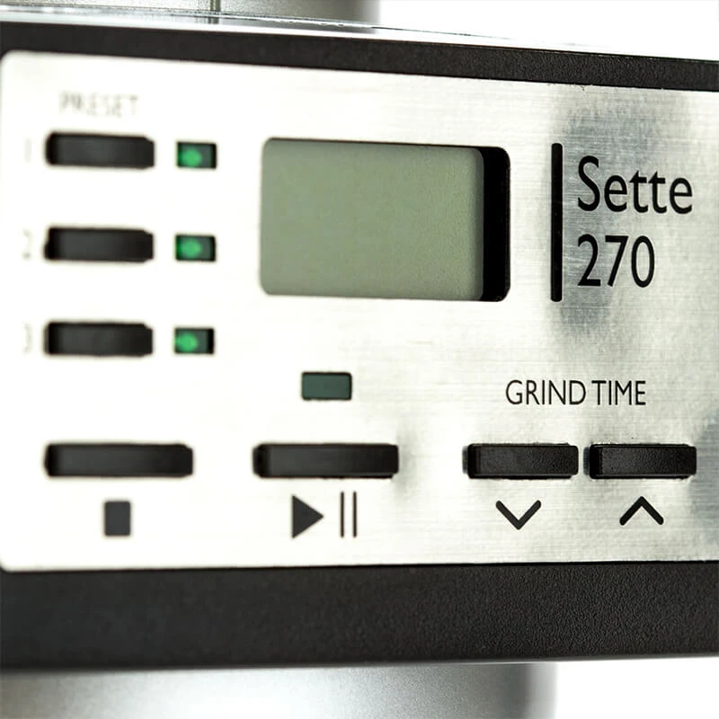 ermöglicht effizientes Mahlen und garantiert eine lange Haltbarkeit. Anders als bei herkömmlichen Kegelmahlwerken rotiert nicht der innere Teil des Mahlwerks, sondern der äußere Teil. Dieses Mahlwerk mahlt mit einer schnellen Leistung für Espresso von 3,5g pro Sekunde und für Kaffee von 5,5g pro Sekunde. Der innovative, herausziehbare Siebträgerhalter ermöglicht eine Ausgabe direkt in den Siebträger, dem mitgelieferten Kaffeemehlbehälter oder auch in den Handfilter wie z.B. den Hario V60. Die Position des Siebträgerhalters kann je nach Zubereitungsart individuell eingestellt werden. Die präzise Timer-Funktion ist auf 0,1 Sekunden genau und ermöglicht daher eine sehr genaue Portionierung. Die Mahlgradeinstellung der Sette 270 wirkt sich unmittelbar aus, da sich keine Kaffeemehl-Reste in der Mühle befinden. Das verbaute LCD-Display ermöglicht einen guten Überblick und bietet einen hohen Bedienungskomfort. Ihnen stehen drei Speichertasten zur Verfügung, die Sie mit individuellen Mahlzeiten programmieren können.